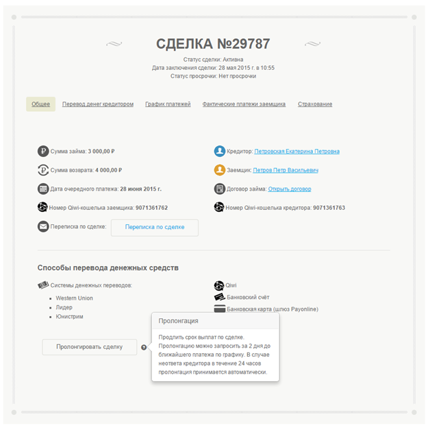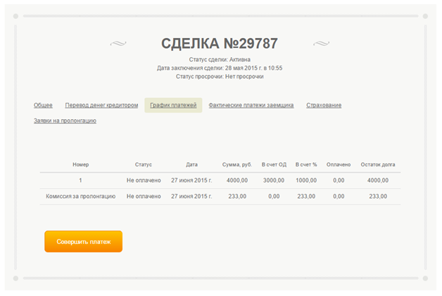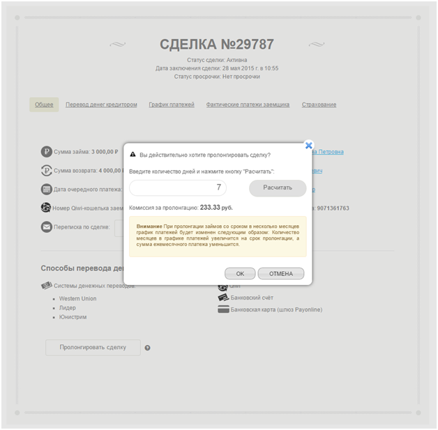 Функционал пролонгации позволяет заемщику продлить срок действия сделки и тем самым отсрочить ближайшую дату платежа по основному долгу. Сумма комиссии за пролонгацию, которая оплачивается заемщиком в пользу кредитора в течение трех дней с момента подтверждения пролонгации рассчитывается на основе процента. Обращаем Ваше внимание, что при пролонгации займов со сроком в несколько месяцев график платежей будет изменен следующим образом: Количество месяцев в графике платежей увеличится на срок пролонгации, а сумма ежемесячного платежа уменьшится.