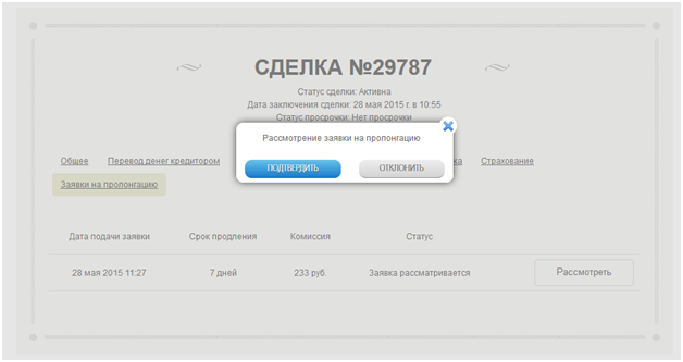 После того, как кредитор подтвердит свое согласие на пролонгацию, статус заявки изменится на новый - "Заявка принята", а на вкладке "Оплатить / График платежей" появится новая строка с комиссией за пролонгацию. Если кредитор не подтвердит свое согласие на пролонгацию в течение двух дней, то статус заявки автоматически сменится на "Заявка принята".