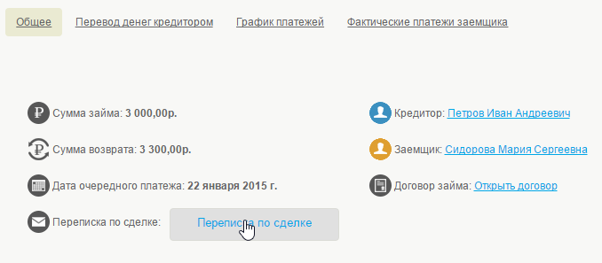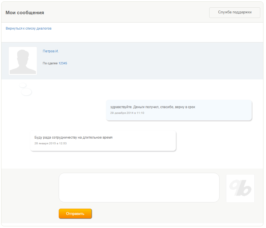 Для того, чтобы связаться с партнером при согласовании сделки, перед тем, как окончательно подписать сделку, кредитор и заемщик могут прикрепить сообщение.