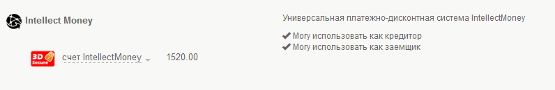 На странице "Доступные способы перевода и получения денег" появится привязанный счет IntellectMoney: